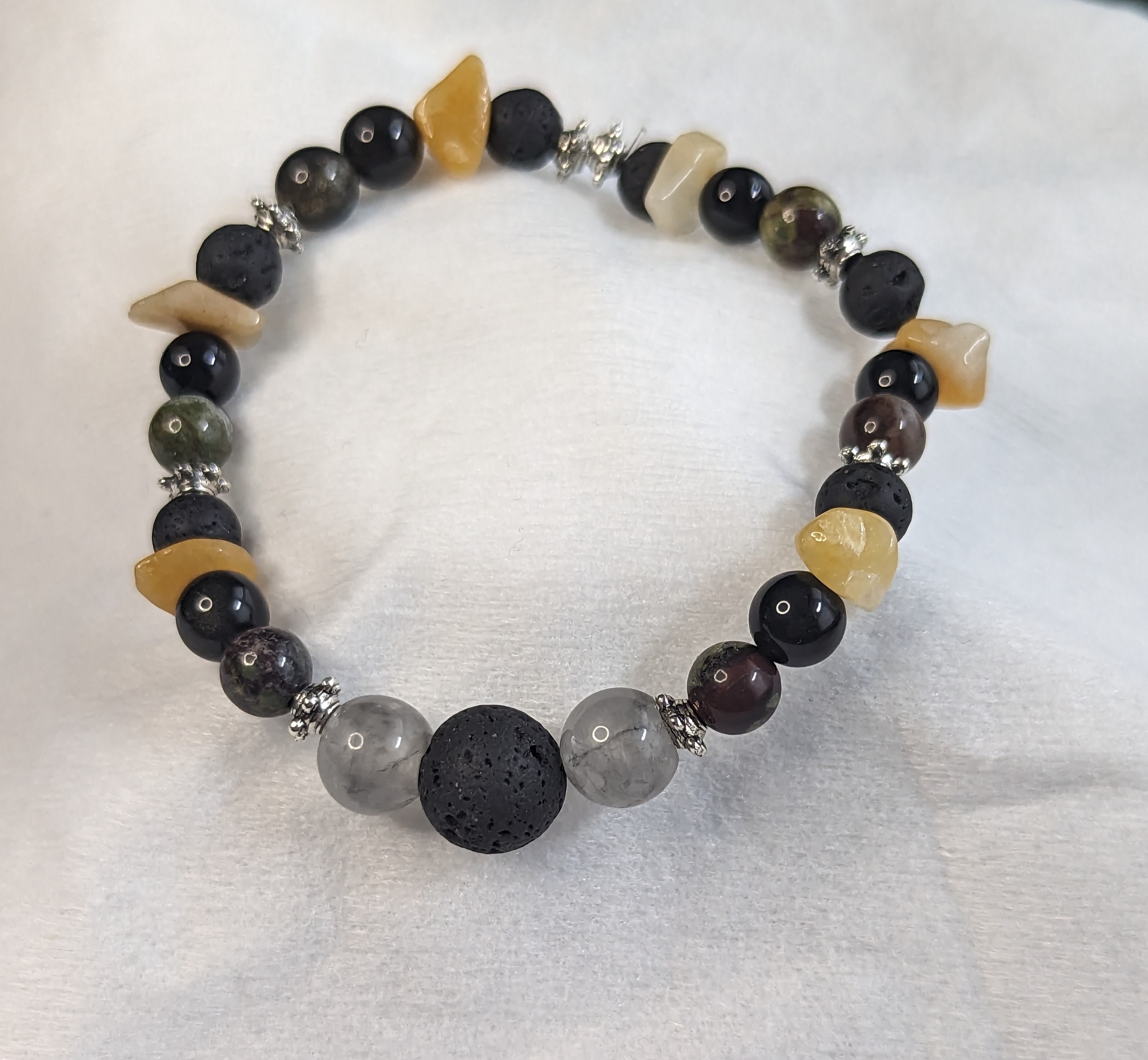 Lava Rock, Calcite, Black Tourmaline, Dragon’s Blood Jasper, and Smokey Quartz